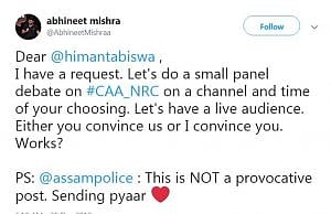 Guwahati :दासान्दि बलीउदनि सावथुन मुलुगाव सोहैबाय नोगोरारि सोदांफिन्नाय आइननि दान्थे बिदान्थे गोनां आयदाया। फेस्ला फावगिरि (Comedian) अभिनिट मिस्र आ आसामनि रांखान्थि बिफाननि मन्थ्रि ड° हिमन्त बिश्व शर्मा बिथांखौ गावनि टुइतार एकाउन्टनि गेजेरजों फोरमायो दि नोगोरारि सोदांफिन्नाय आइन,एन आर सि नि सायाव गोथौयै दान्थे बिदान्थे हाबाफारिनि थाखाय टि भि सेनेल, आरो समखौ थिग खालामदों। जों बाहागो लानो राजि दं।जेराव थागोन लाइभ अडियेन्स। नों (हिमन्त) थाग थियारि खालामदो नङाब्ला जों थिग थिम खालामगोन होन्ना चेलेन्ज होयो।